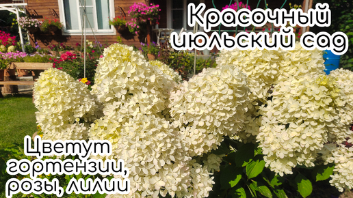 Красочный июльский сад. Цветут гортензии, розы, клематисы, лилии