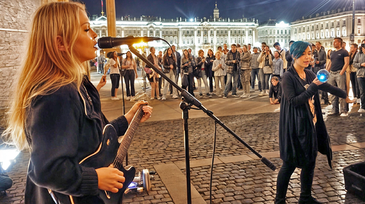 Уличные музыканты выступают на Дворцовой площади под аркой Главного штаба
