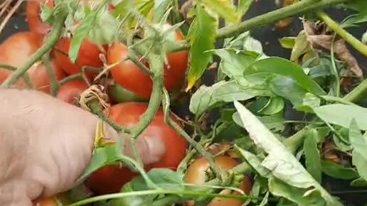 Сбор помидор на огороде.