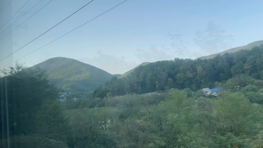 Вид на зеленые горы из окна поезда, когда уезжаешь из Сочи