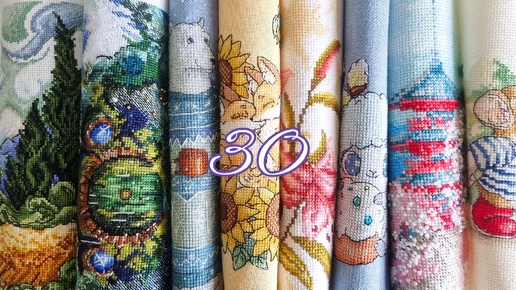 30 вышитых, но не оформленных картин крестиком / рулон готовых работ