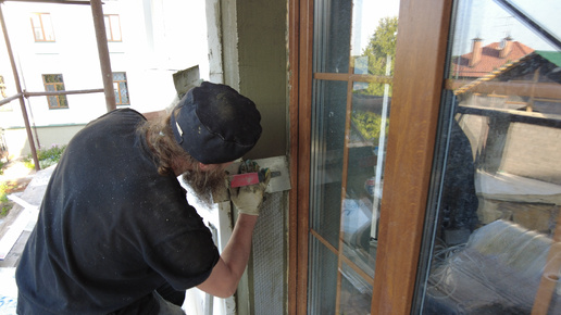 Технология армирования оконных откосов, утеплённых пенопластом, СФТК Мокрый Фасад. В клей Цементум втапливаем косынки, уголки с сеткой