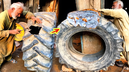 «Загадка дыры» удивительный ремонт колеса от трактора, дед мастер на все руки в одиночку справился с огромным колесом, тракторист довольный!