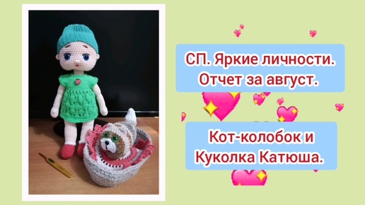 СП. Яркие личности. Отчёт за август. Связала кота колобка из плюша и куколку Катюшу. Примерка головных уборов на Катю. Волосы не готовы.