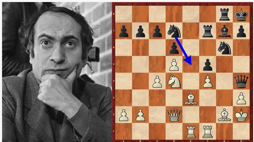 Михаил Таль жертвует качество 26...♖xa2, играя черными против Боттерила английском г. Бат. Красивая победа черных в сицилианке. 0-1
