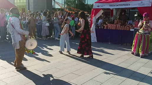 Мужчина играет на барабане, зрители танцуют на фестивале "День Индии" в Москве, в Парке аттракционов "Остров Мечты"