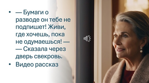 — Бумаги о разводе он тебе не подпишет! Живи, где хочешь, пока не одумаешься! —— Сказала через дверь свекровь. Видео рассказ