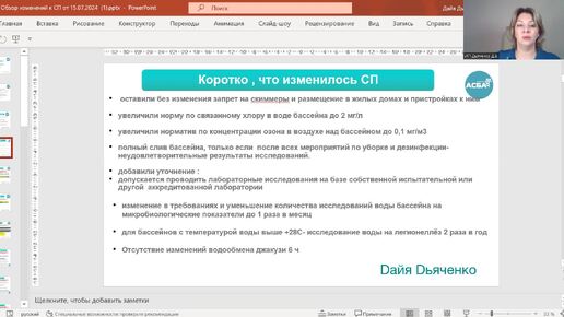 Разбираем изменения в СП 2.1.3678-20 Бассейны. Дайя Дъяченко - председатель президиума АСБА