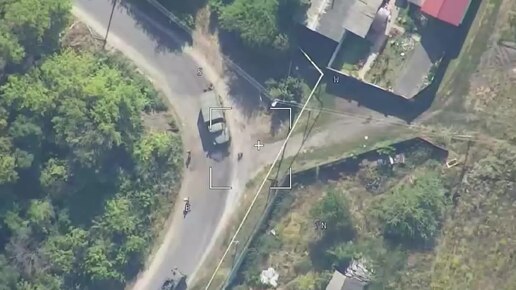 Кадры поражения боевой бронированной машины и грузового автомобиля ВСУ с использованием барражирующего боеприпаса "Ланцет"