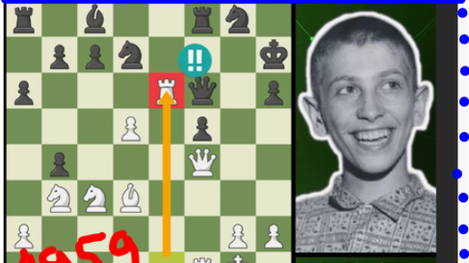 Совсем еще юный Бобби Фишер заявляет миру о своем таланте. Здесь он грамотно, с точностью 96%, жертвуя качество 22.♖xh5 громит Бента Ларсена