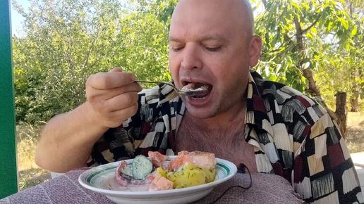 ОБЖОР форель с картошкой и салат из овощей/мукбанг на даче