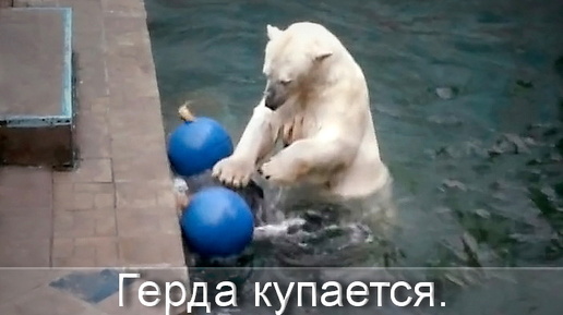 Белая медведица Герда после завтрака искупалась два раза, а Каюшка гуляет в соседнем вольере.