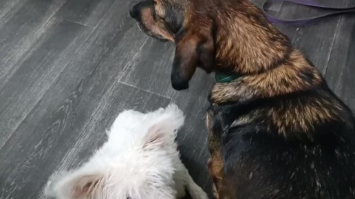 Собаки приюта Герда и Зайка соревнуются за внимание директора приюта Ананда, Наргизы Муминовой. Видео с канала Ананда Кураторы в Телеграмме