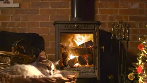 Новогодний уют: атмосфера ASMR-камина с мурлыкающим котом для расслабления и сна
