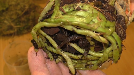 Корни орхидеи кишмя кишат, а листьев мало. Пора Увеличивать Горшок! Два года в кокосовых чипсах.