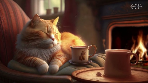 Идеальная безмятежность. Мурлыканье кошки и звуки камина для комфорта и расслабления