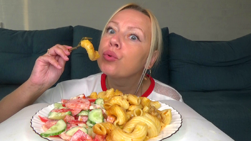 Мукбанг фирменный рецепт Макароны по Яновски, салат овощной с мазиком. еда.