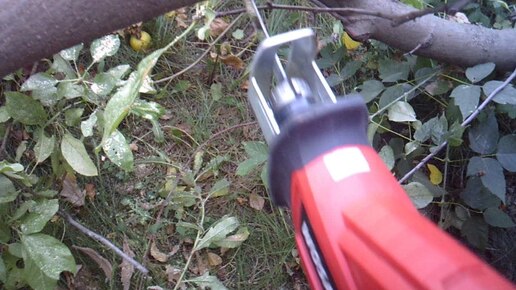 Распиливание ветки яблони сабельной электропилой WOSAI