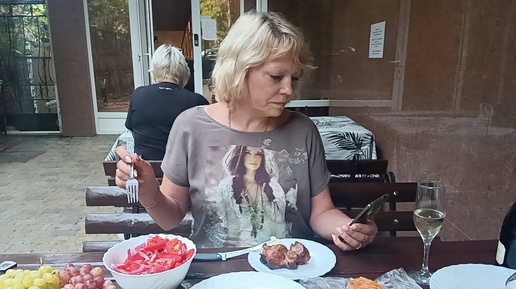Сервирует стол вкусностями.