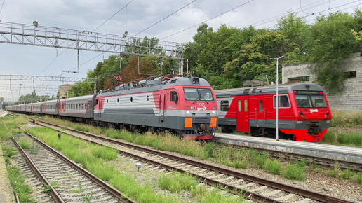 Встречные поезда в Пятигорске. Прибытие ЭД9Э-0051 сообщением Мин. Воды - Кисловодск и отправление ЭП1М-687 с поездом Кисловодск - Киров