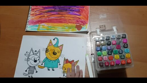 Специальными маркерами раскрасила рисунок Три кота и нарисовала разноцветный закат