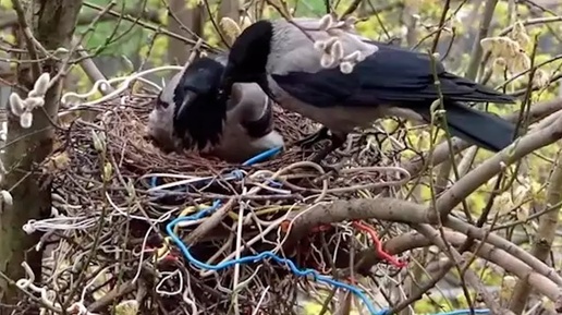 Семья ворон кормит своих птенцов в гнезде, часть 2