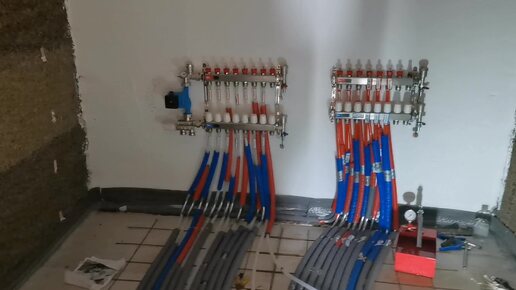 Закончили раскладку труб теплого пола и радиаторов. Заливаем котельную из арболита.
