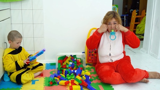 Ребенок нянчится с мамой соска во рту кормит кашей и играет с конструктором. Она плачет и хочет