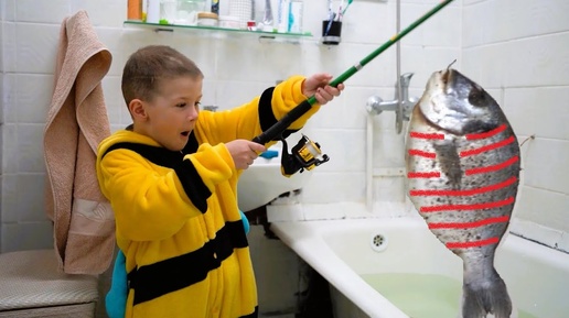 Ребенок проголодался и пошел ловить рыбу удочкой в ванной и приготовил ее на сковороде