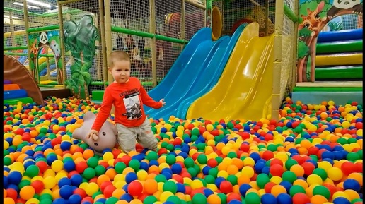 Ребенок катается на детской площадке с горки и ползает в бассейне с шариками