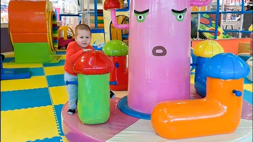 A child runs on the playground, plays on the carousel, rides on balls