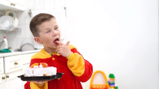 A child rode a donkey and fell on the floor and got a bump Mom brought a cake