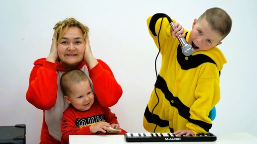 Ребенок учится петь играет на пианино и мешает маме спать в кровати