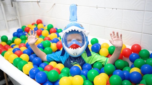Играем с цветными шариками в ванной в маске акуленка и слушаем детскую песню