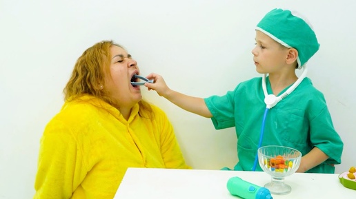 Ребенок стоматолог лечит больные зубы после конфет