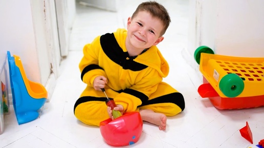 A child inflates a ball and kicks it at his mother, hits his mother in the face and pours tea fr