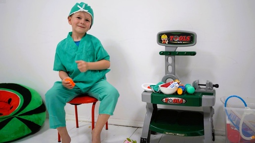 A child plays dentist, feeds his mother candy, his mother is in pain and he treats her