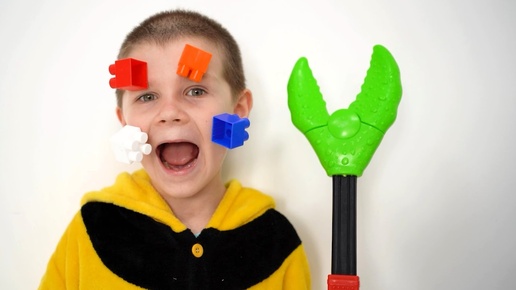 The child falls on the cubes; they stick to his face and the mother removes them