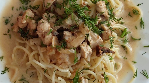 1655. Спагетти с курицей и грибным соусом из рыжиков.