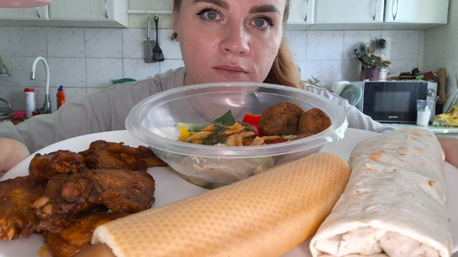 Мукбанг шаурма, хот дог, крылышки барбекю и интересный салат Боул с фалафелем #мукбанг