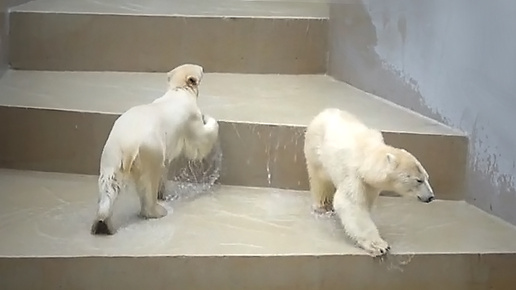 Белые медвежата с утра искупались и ушли завтракать в берлогу.