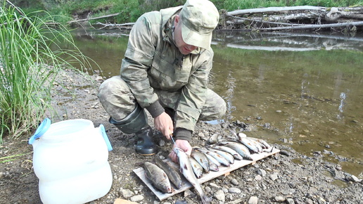 В такой маленькой речке, наловили много хариуса. Чистка рыбы и ее засолка для сохранения. Жарим на сковороде свежую рыбу.