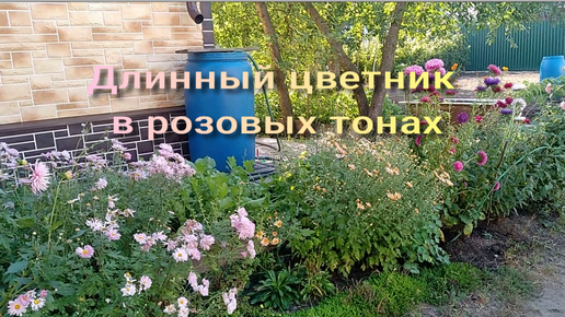 Длинный цветник в розовых тонах в сентябре: нежные хризантемы, игольчатые астры и георгина «Старс Леди»