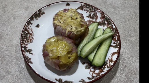 Картошка запечённая в духовке в беконе с сыром и яйцом.