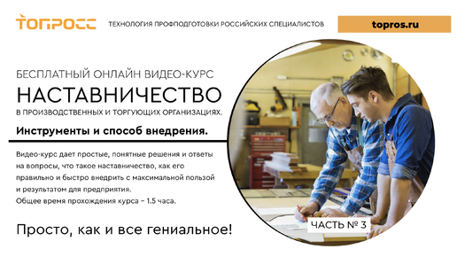 ЧАСТЬ 3 БЕСПЛАТНЫЙ ОНЛАЙН ВИДЕО-КУРС "НАСТАВНИЧЕСТВО В ПРОИЗВОДСТВЕННЫХ И ТОРГУЮЩИХ ОРГАНИЗАЦИЯХ".