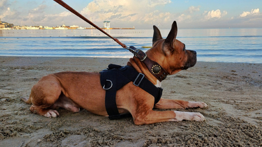 Гуляем с Зевсом по утреннему пляжу. Людей очень мало. Море спокойное. Вода чистая. Рыбаки на причале. Анапа. Сентябрь 2024.