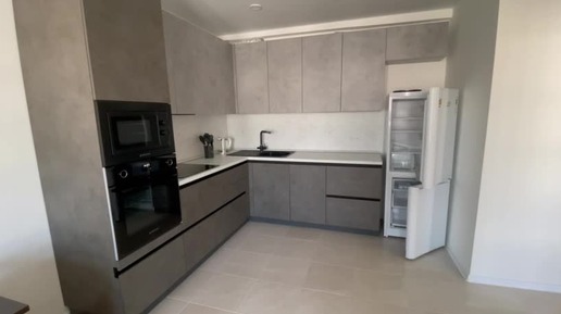 Кухня на заказ в ЖК Бутово Парк 2. Кухня из ЛДСП Egger цвета бетон Чикаго в темно и светло-сером оттенках.