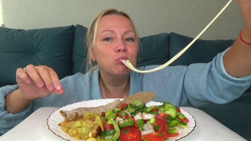 Мукбанг диетически, МИни Шаурмишка, салат с маслом и конечно кабачки жареные. еда.