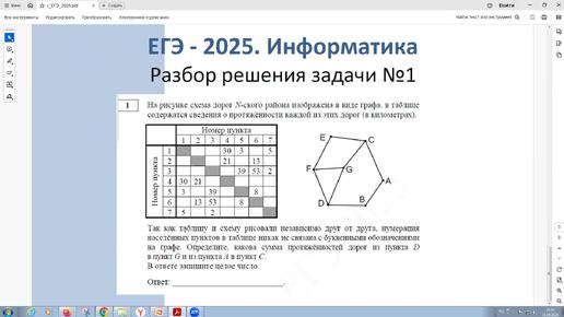 ЕГЭ - 2025. Информатика. Задача 1. На рисунке схема дорог изображена в виде графа, в таблице содержатся сведения о протяжённости дорог