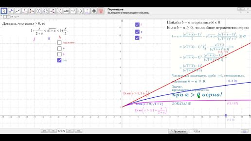 Часть 2. доказать, что при x>0 выполняется двойное неравенство [1+x/(2+x)]<√(1+x)<[1+x/2]. Графическое доказательство 🔇